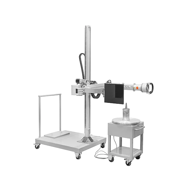Манипулятор позволяет расположить рентгеновский аппарат и детектор в любой плоскости относительно объекта контроля на необходимой высоте в диапазоне вертикального хода стрелы (ось Y) и наклона манипулятора (ось U). Дополнительно манипулятор имеет возможность ручного изменения фокусного расстояния за счет перемещения штанги крепления детектора на основании П-образного манипулятора. Защитные кабельные цепи манипулятора исключают обрывы, перегибы и излишнее натяжение кабельных трасс во всем диапазоне перемещений. Перемещение по осям манипулятора осуществляется с помощью шаговых мотор-редукторов.