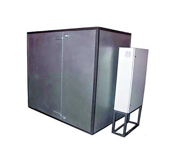 Камера радиационной защиты выполнена из стали и свинца в соответствии с международными стандартами по защите окружающей среды от рентгеновского излучения. Камера оснащена двумя пневматическими загрузочными дверями и одной рабочей зоной. Камера предназначена для контроля изделий, уложенных на паллеты с размерами 1200х1200 мм. Предусмотрена дверь для технических нужд и просмотровое рентгенозащитное окно с передней стороны. Контроль за безопасной работой осуществляется многофункциональным контроллером и обеспечивает 4 уровень безопасности. В системе безопасности применяются только магнитные выключатели. Установка оснащена световой индикацией работы. Камера приспособлена для перемещения с помощью погрузчика.