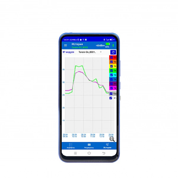 Просмотр результатов измерений может быть осуществлен в любое время с помощью приложения на смартфоне. Ограничением данного способа контроля результатов измерений является необходимость присутствия оператора в зоне устойчивого Bluetooth соединения модуля со смартфоном, на расстоянии не менее 10 м между ними.